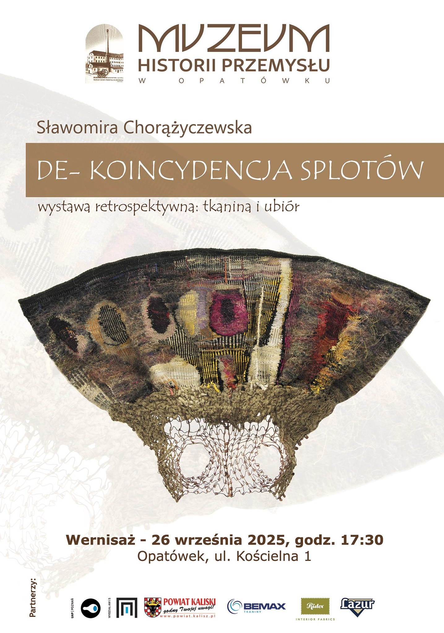 W piątek, 26 września 2025 r. o godz. 17.30 w Muzeum Historii Przemysłu w Opatówku odbędzie się wernisaż wyjątkowej wystawy prof. Sławomiry Chorążyczewskiej z Uniwersytetu im. Magdaleny Abakanowicz w Poznaniu, zatytułowanej: De – Koincydencja splotów. Wystawa retrospektywna tkanina i ubiór unikatowy.